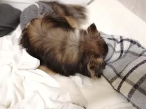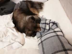 腹巻き1号犬チロルは、毛布代わりの膝掛けに鼻を突っ込んで爆睡中…